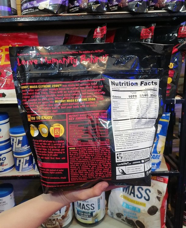 هر وعده MUTANT MASS EXTREME 2500 تنها با دو فنجان شیر 1% مخلوط می شود، 1270 کالری، 46 گرم پروتئین، 255 گرم کربوهیدرات و 7.5 گرم چربی سالم به ارمغان می آورد.