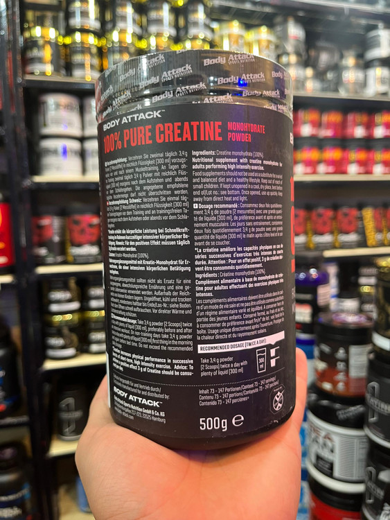 پیور کراتین بادی اتک 500 گرم Body Attack 100% Pure Creatine یک مکمل کراتین خالص است که از طریق فرایند میکرونیزه کردن ساخته می شود که جذب را در بدن بسیار ساده تر و سریعتر می کند. همچنین در طی یک فرایند فراوری دقیق، ناخالصی ها حذف می شود و کیفیت محصول تضمین می شود.بهبود عملکرد ورزشی با افزایش سطح انرژی و قدرت در زندگی روزمره و در طول تمرین.بهبود کلی در تامین انرژی میتوکندری، که نه تنها در عضلات، بلکه در مغز شما نیز وجود داردحمایت از روند ریکاوری بدن، ترویج خواب آرام و کاهش آسیب و التهاب بافت عضلانی.کراتین خالص حجم و تعریف عضلات را بهینه می کند و به دستیابی سریعتر به اهداف تمرینی کمک می کند.کراتین هم برای عضلات و هم برای مغز مفید استخستگی، افسردگی مزمن مرتبط با استرس را از بین می برد و به سلامت کلی شما کمک می کند.خرید پیور کراتین بادی اتک 500 گرم Body Attack 100% Pure Creatineبا مصرف پیور کراتین بادی اتک 500 گرم Body Attack 100% Pure Creatine می توانید قدرت خود را افزایش دهید. فرقی نمی کند برای دوی سرعتی یا انجام آخرین ست تمرین خود تلاش می کنید، با استفاده از مکمل بادی اتک می توانید به ریکاوری دست پیدا کنید و بهترین عملکرد ورزشی را داشته باشید. پودر کراتین مونوهیدرات بادی اتک بدون هیچ گونه ماده افزودنی ساخته شده است و به راحتی در آب یا آب میوه حل می شود.کراتین یک ماده طبیعی است که توسط بدن تولید می شود و از اسیدهای آمینه گلیسین، آرژنین و متیونین در کبد، کلیه ها و پانکراس تشکیل می شود. انواع مختلفی از کراتین وجود دارد. مونوهیدرات مخصوصاً به راحتی در بدن جذب می شود و ماده فعال قدرتمند در کراتین 100٪ خالص است. کراتین فسفات نقش مهمی در تامین انرژی بدن به ویژه در هنگام فعالیت کوتاه و شدید دارد. از این مزیت برای افزایش عملکرد بدنی خود در حین تمرین استفاده کنید.پیور کراتین بادی اتک 500 گرم Body Attack 100% Pure Creatine کراتین مونوهیدرات با کیفیت بالا را برای شما فراهم می کند بدون اینکه مواد افزودنی یا مواد زائد را دریافت کنید.طریقه مصرف کراتین مونوهیدرات بادی اتک3.4 گرم پودر (2 پیمانه) را دو بار در روز با مقدار زیادی آب (300 میلی لیتر) ترجیحاً قبل و بعد از تمرین عضلانی مصرف کنید. در روزهای بدون تمرین، 3.4 گرم پودر همراه با مایعات فراوان (300 میلی لیتر) صبح بعد از بیدار شدن و عصر قبل از خواب مصرف کنید.مکمل های غذایی جایگزین یک رژیم غذایی متعادل و متنوع نیستند. از دوز روزانه توصیه شده نباید بیشتر شود. محصول را دور از دسترس کودکان نگهداری کنید. به صورت درب بسته در جای خنک و خشک نگهداری شود. از گرما و نور مستقیم محافظت کنید.ارزش غذاییبه ازای3.4 گرمکراتین مونوهیدرات 3400 میلی گرمکراتین 3000 میلی گرممواد تشکیل دهنده: کراتین مونوهیدرات 100 درصد خالص