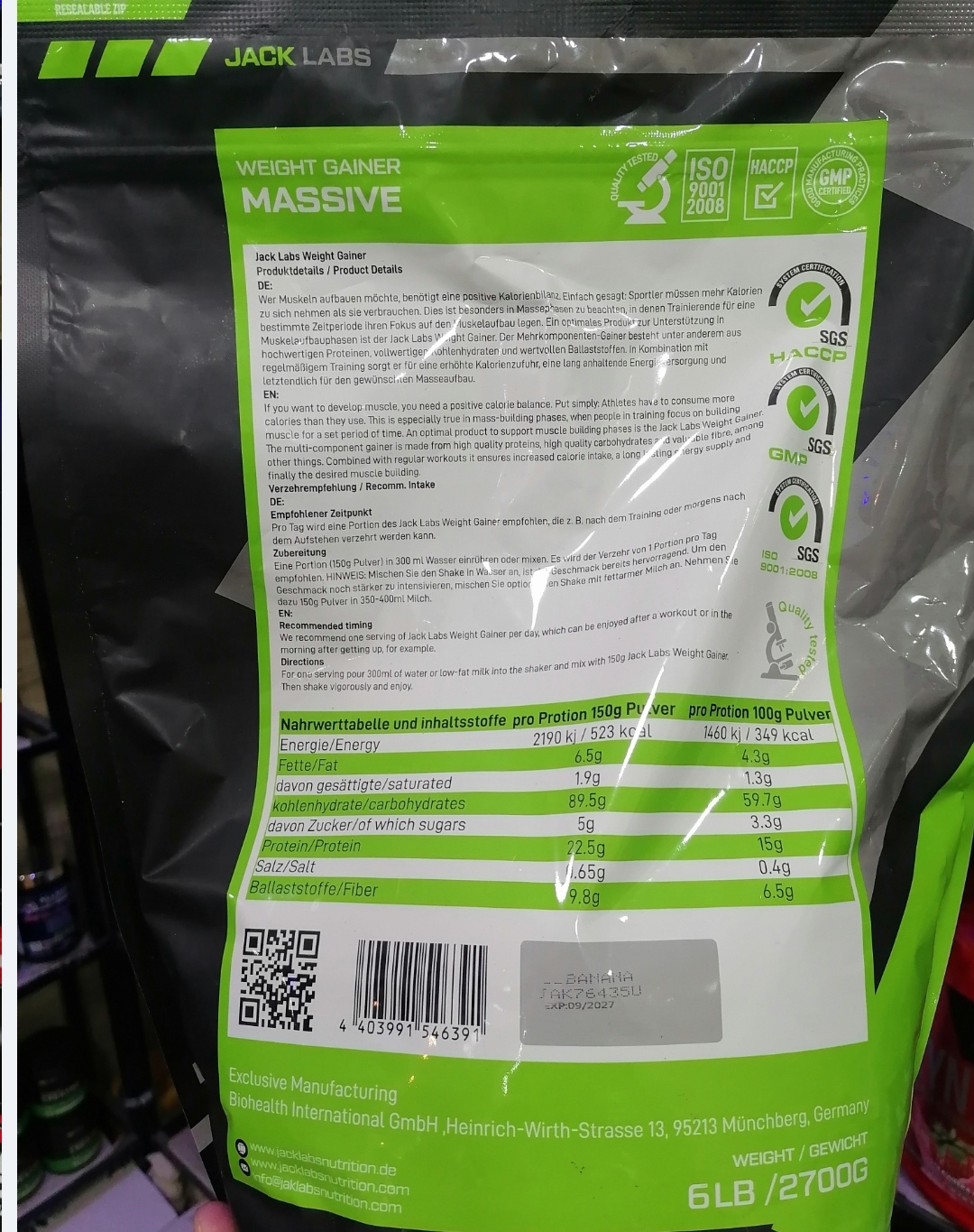 با میزان بالای کربدهیدرات و پروتئین کالری مورد نیاز برای افزایش وزن و حجم عضلات را پشتیبانی میکند