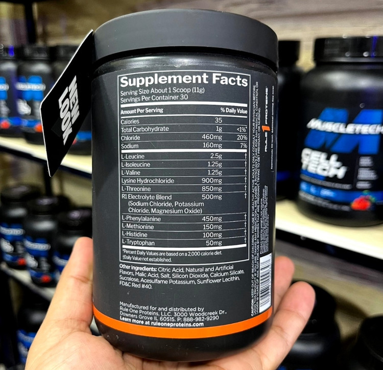 هر پیمانه این مکمل (حدود ۱۱.۵ گرم) شامل ۱۰ کالری، ۱ گرم کربوهیدرات کل، ۴۶۰ میلی گرم کلراید، ۱۶۰ میلی گرم سدیم، و ۷.۵ گرم از اسیدهای آمینه ضروری (لوسین، ایزولوسین، والین، لیزین هیدروکلراید، ترئونین، فنیل آلانین، متیونین، هیستیدین و تریپتوفان) است. همچنین، ۵۰۰ میلی گرم ترکیب الکترولیت نیز در این محصول RULE 1 وجود دارد که به هیدراتاسیون بدن کمک میکند. مکمل آمینو EAA رول وان بدون گلوتن، قند و مواد ممنوعه است و دارای تاییدیه GMP آمریکا میباشد همچنین، در چند طعم مختلف از جمله لیموناد بلو رازبری، انبه هلو، آب نبات رنگین کمانی و پانچ میوه عرضه میشود.
