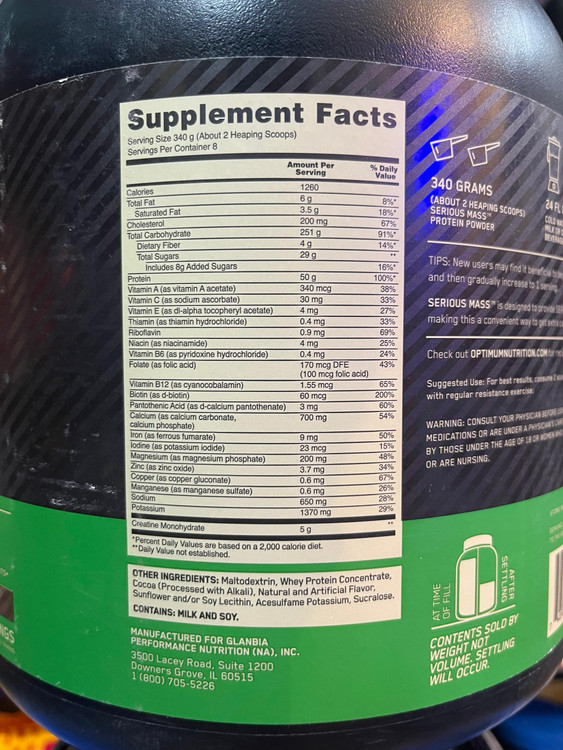 مکمل گینر سریوس مس شرکت اپتیموم نوتریشن ON یکی از بهترین مکمل های موجود برای افزایش وزن و ساخت عضلات است. با وجود 1260 کالری به ازای دو اسکوپ و 50 گرم پروتئین، این مکمل میتواند از ریکاوری عضلات تان پشتیبانی کند و یک محصول عالی برای بعد از تمرین و بین وعده های غذایی تان باشد. مکمل سریوس مس مواد تشکیل دهنده ای در خود دارد که شما را در رسیدن به اهداف افزایش وزن تان یاری میکند.